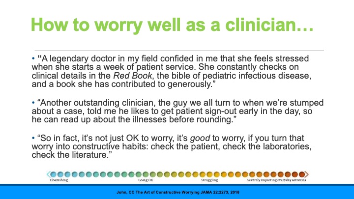 I had the honor of speaking at the American College of Surgeons this week on a panel about stressors clinicians have control over i.e. can modify. I was assigned a topic I had not really thought about before – which meant I learned a lot! After the talk, there were many people who came up to me and asked if they could have my slides… so here they are!