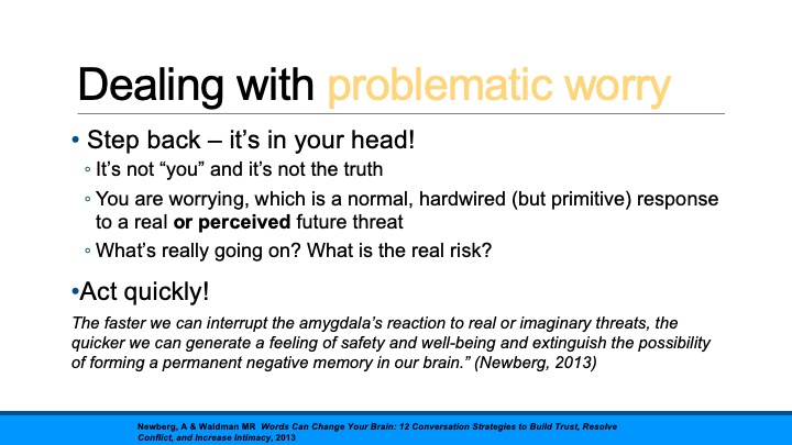 It’s super important that you act – quickly. This is your amygdala trying to hijack your brain! (Remember flight-flight-freeze?) If you don’t derail it quickly, it will continue to spiral and land you in a world of anxiety. In other words, follow all the steps for problematic worry – but if it doesn’t work, don’t wait. Get help.