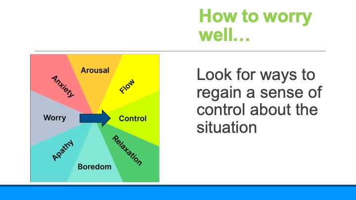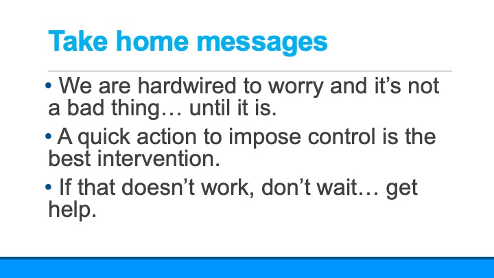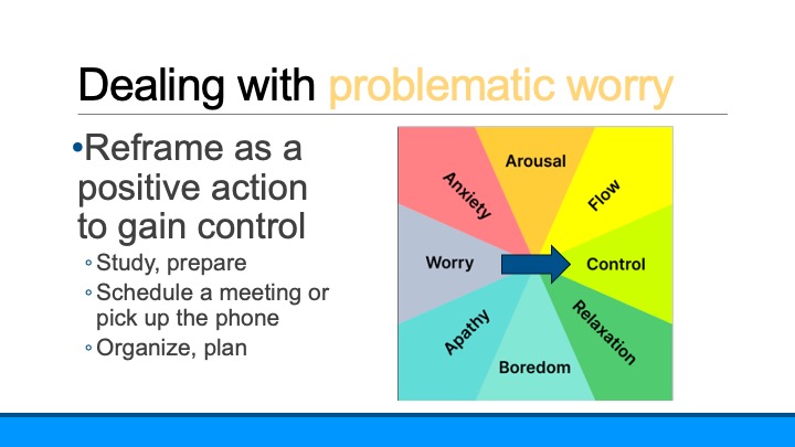 The way to deal with problematic worry is to try to return it to the kind of worrying that helps us, which we can do with any action to control what we are worried about. Worried about a test? Make a plan for how and when to study. Worried about a relationship? Plan to meet or pick up the phone to talk. Again – no matter what your are worried about – do something to create a plan to address the worry.
